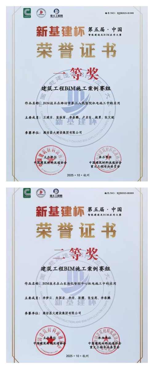 據(jù)悉,本屆大賽采取企業(yè)自愿參賽機制,經(jīng)過嚴格的形式審核、在線評審、視頻答辯及結果公示等環(huán)節(jié),最終確定獲獎成果。其中,由集團第二安裝公司申報的《BIM技術在濰坊市第三人民醫(yī)院機電施工中的應用》和《BIM技術在山東?;强刂行臋C電施工中的應用》分別榮獲一等獎和二等獎。